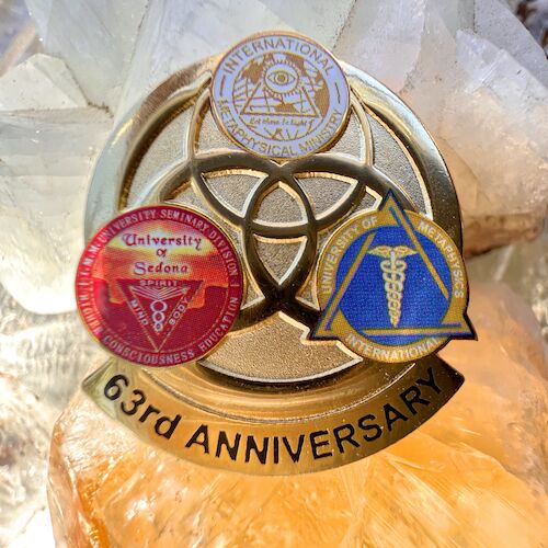 Whether you are a counselor, coach, teacher, speaker, minister, or any other kind of spiritual practitioner, this 63rd Anniversary Pin is like a mobile diploma. Whenever you wear it, it tells those you serve that you have been trained by an institution that has been teaching metaphysics for six decades. Not a graduate yet? Then wear this pin to show that you are a proud student of the largest metaphysical university system of its kind. This handsome gold-tone pin measures 1¼ inch from top to bottom and features the emblems of the University of Metaphysics and University of Sedona, as well as the International Metaphysical Ministry.